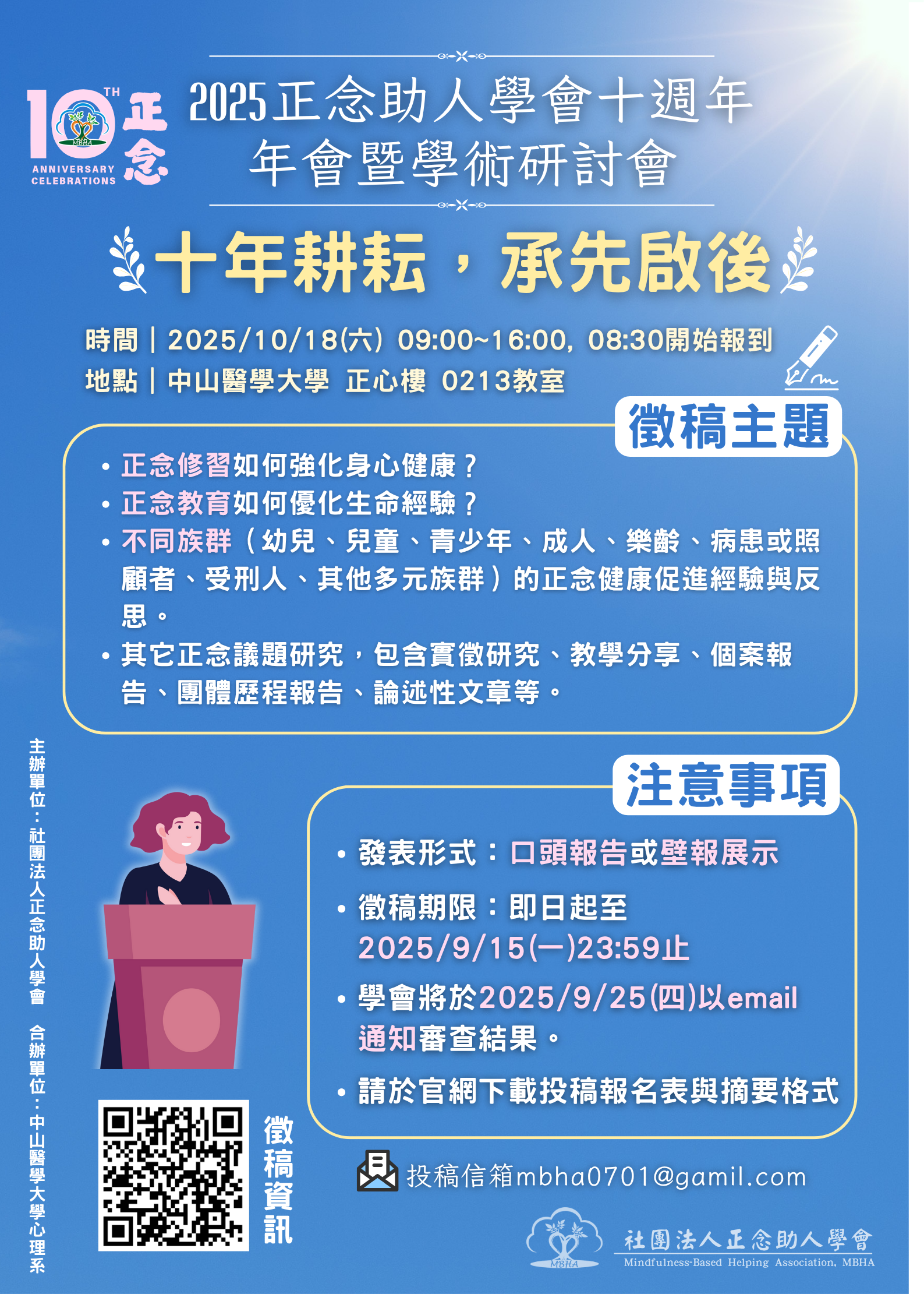 正念助人學會將於 114 年 10 月 18 日舉辦「十年耕耘,承先啟後 — 2025 十週年年會暨學術研討會」,
