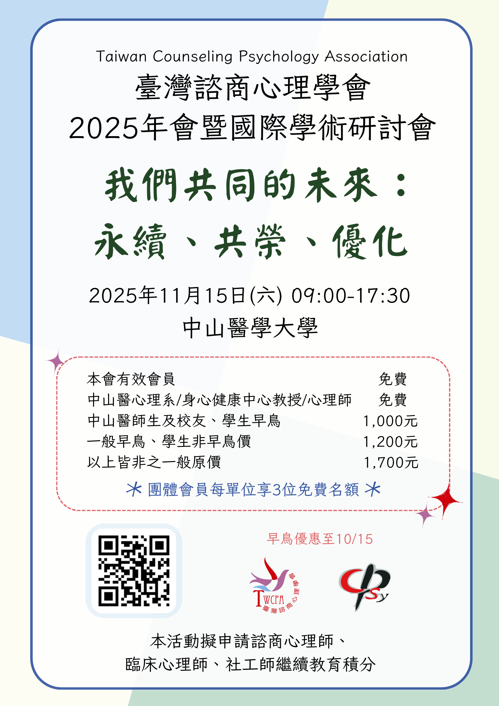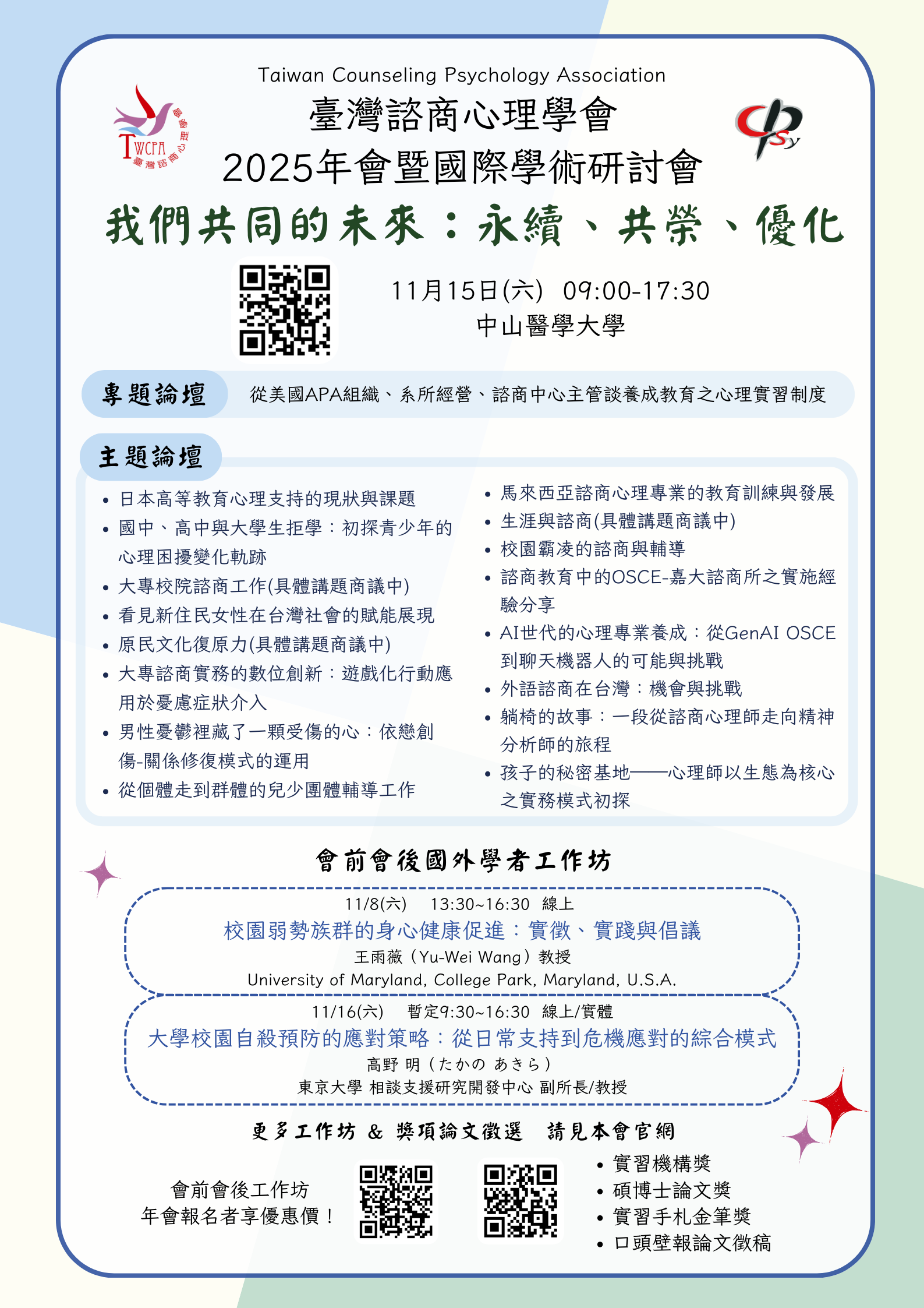 2025臺灣諮商心理學會年會暨學術研討會:我們共同的未來: 永續、共榮、優化