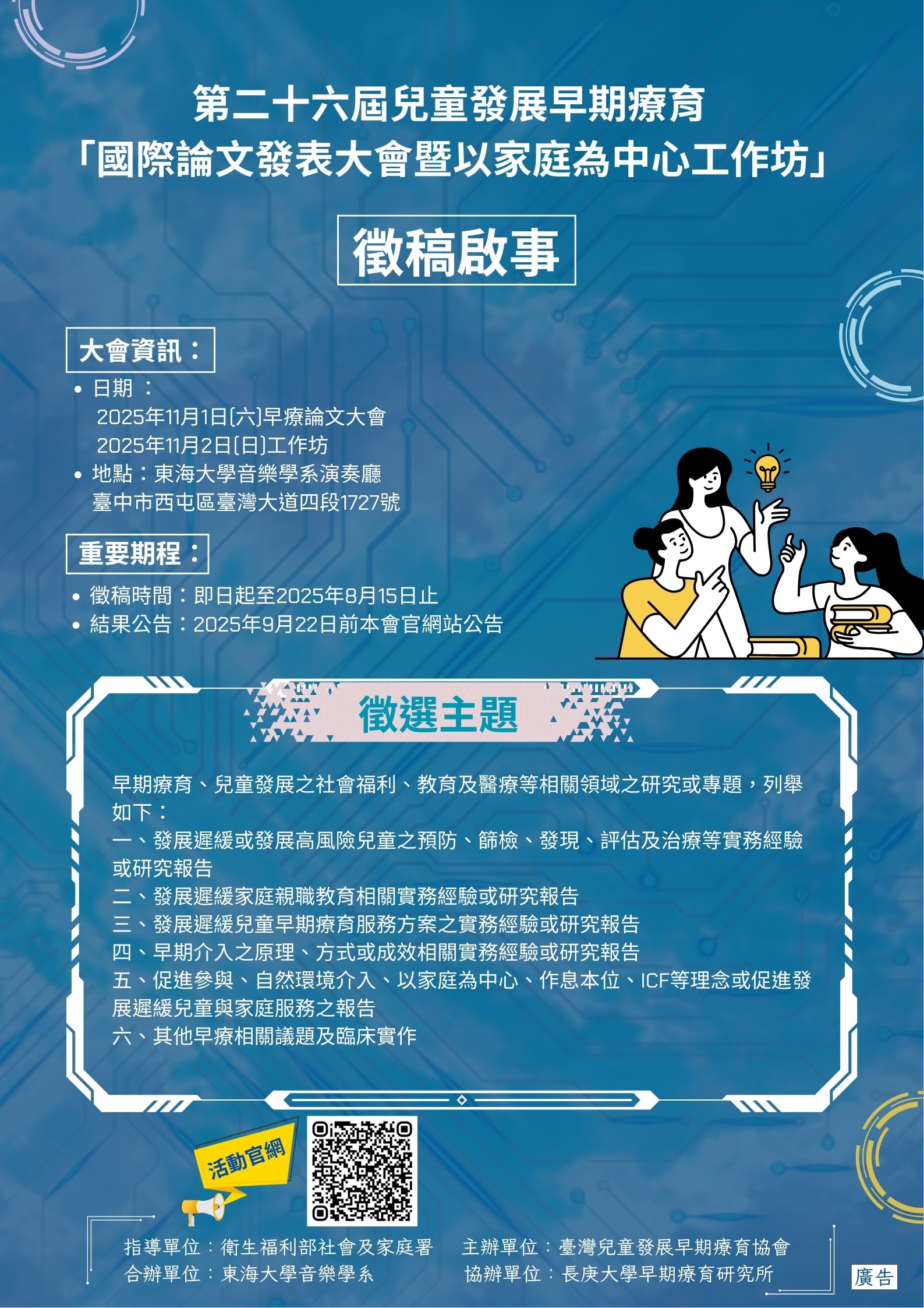 說明: 一、本屆大會謹訂於2025年11月1-2日假東海大學音樂學系演奏廳舉行,即日起公開徵求論文摘要及服務方案成果報告,相關徵稿規定及投稿方式請參閱附件徵稿啟事。 二、徵稿時間自即日起至8月15日止,採線上投稿,欲投稿者,請掃描單張上方QR碼至活動官網進行投稿。若有任何需要之處,請於上班時間(星期一至星期五,上午8時至下午5時)來電臺灣兒童發展早期療育協會公務手機0968-353739洽詢。
