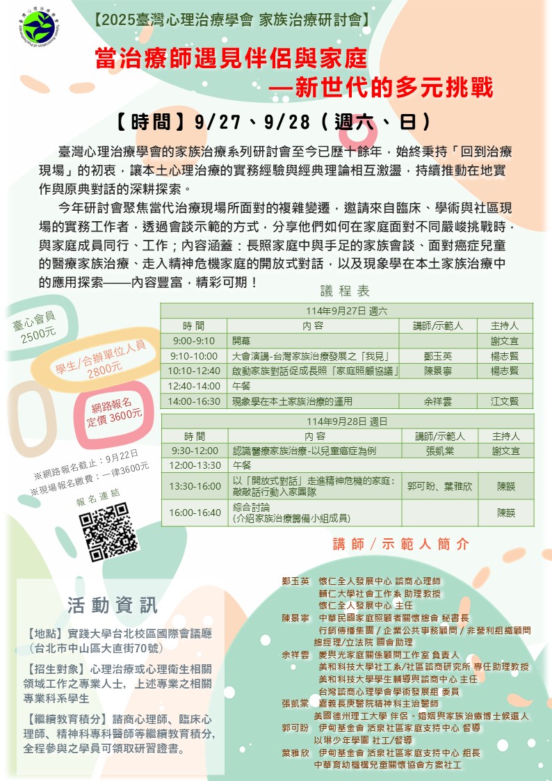 臺灣心理治療學會的家族治療系列研討會至今已歷十餘年, 始終秉持「回到治療現場」的初衷, 讓本土心理治療的實務經驗與經典理論相互激盪, 持續推動在地實作與原典對話的深耕探索。今年研討會以「 當治療師遇見伴侶與家庭——新世代的多元挑戰」為主題, 聚焦當代治療現場所面對的複雜變遷,邀請來自臨床、 學術與社區現場的實務工作者,透過會談示範的方式, 分享他們如何在家庭面對不同嚴峻挑戰時,與家庭成員同行、工作。 本次內容涵蓋:長照家庭中與手足的家族會談、 面對癌症兒童的醫療家族治療、走入精神危機家庭的開放式對話, 以及現象學在本土家族治療中的應用探索——內容豐富,精彩可期!