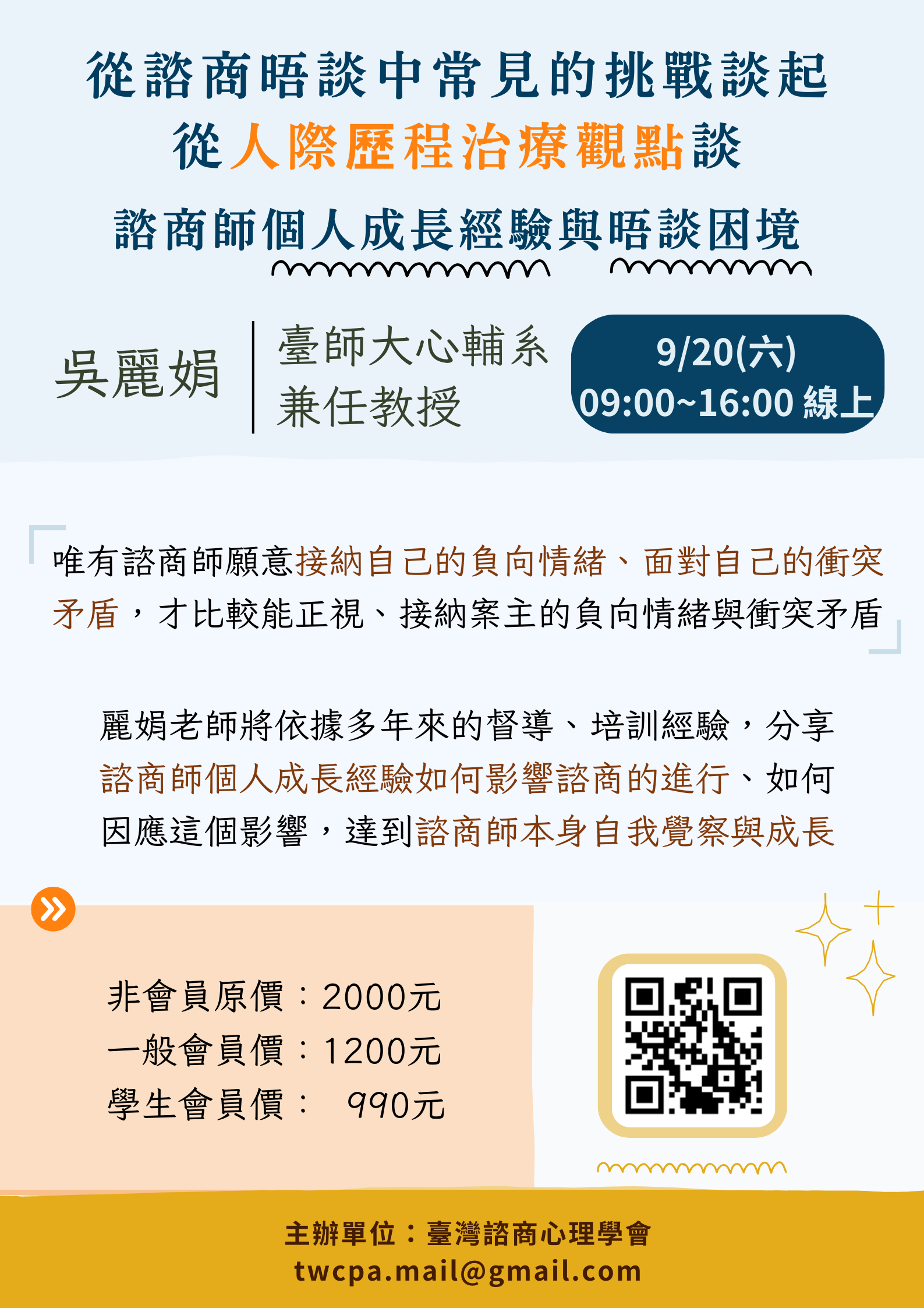 【課程名稱】從諮商晤談中常見的挑戰談起:從(吳氏) 人際歷程治療觀點談諮商師「個人成長經驗」與晤談困境