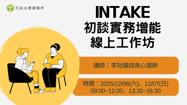 【2025元品經典講堂_初談實務增能線上工作坊】為心理師與社工師設計,陪你一起面對真實現場的挑戰。李冠儀心理師將以多年初談經驗,帶領你梳理初談概念與架構,學會如何在有限時間中抓住重點、有效分類危機層級,為後續評估與派案打下穩固基礎。