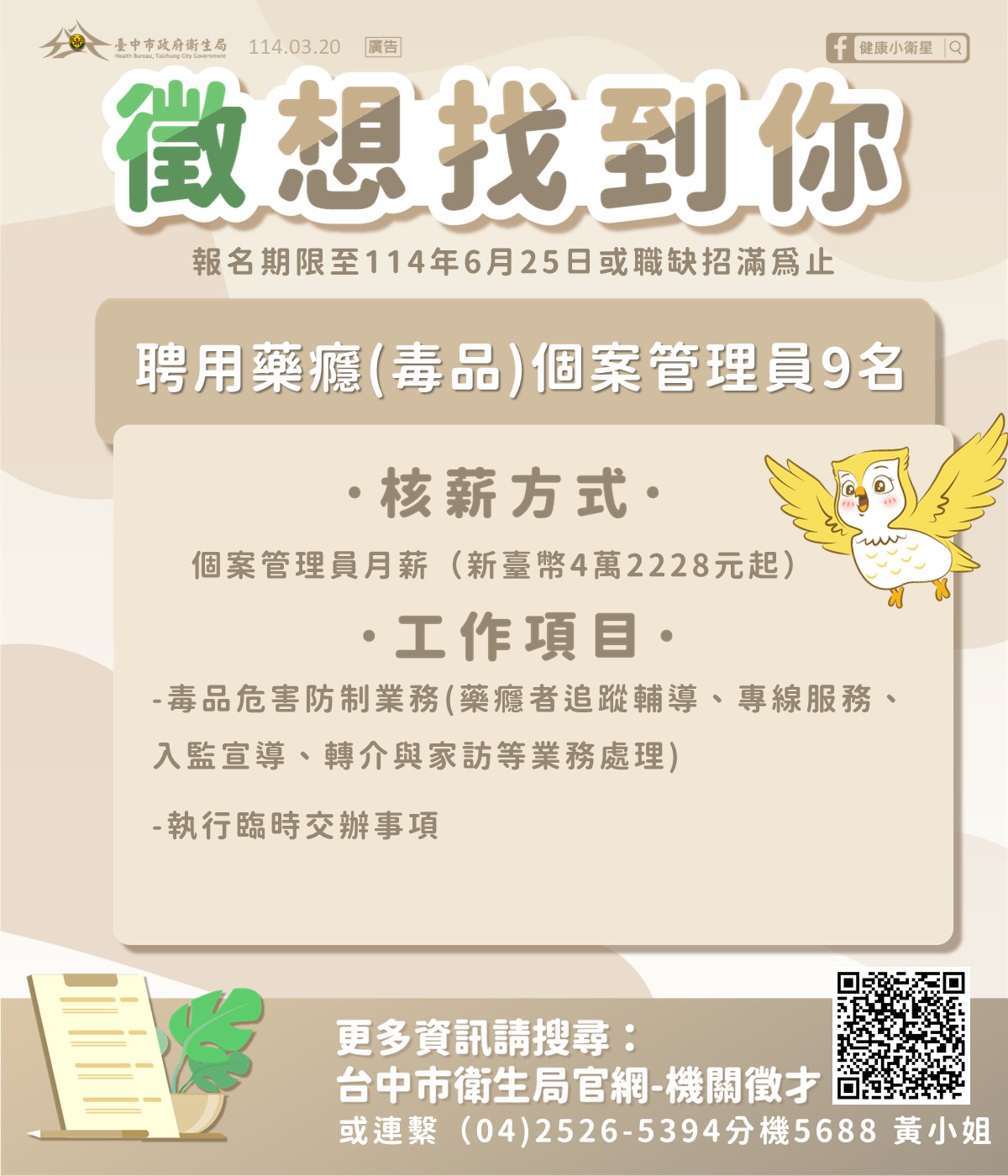 【臺中市衛生局心理健康科-徵才公告】