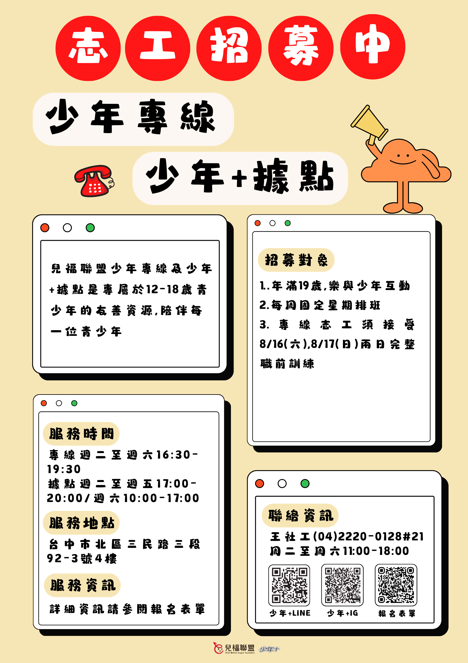 服務資格:1.年滿19歲,須接受電訪或面談 2.每周固定星期排班 3.專線志工須接受114/8/16(六)、114/8/17(