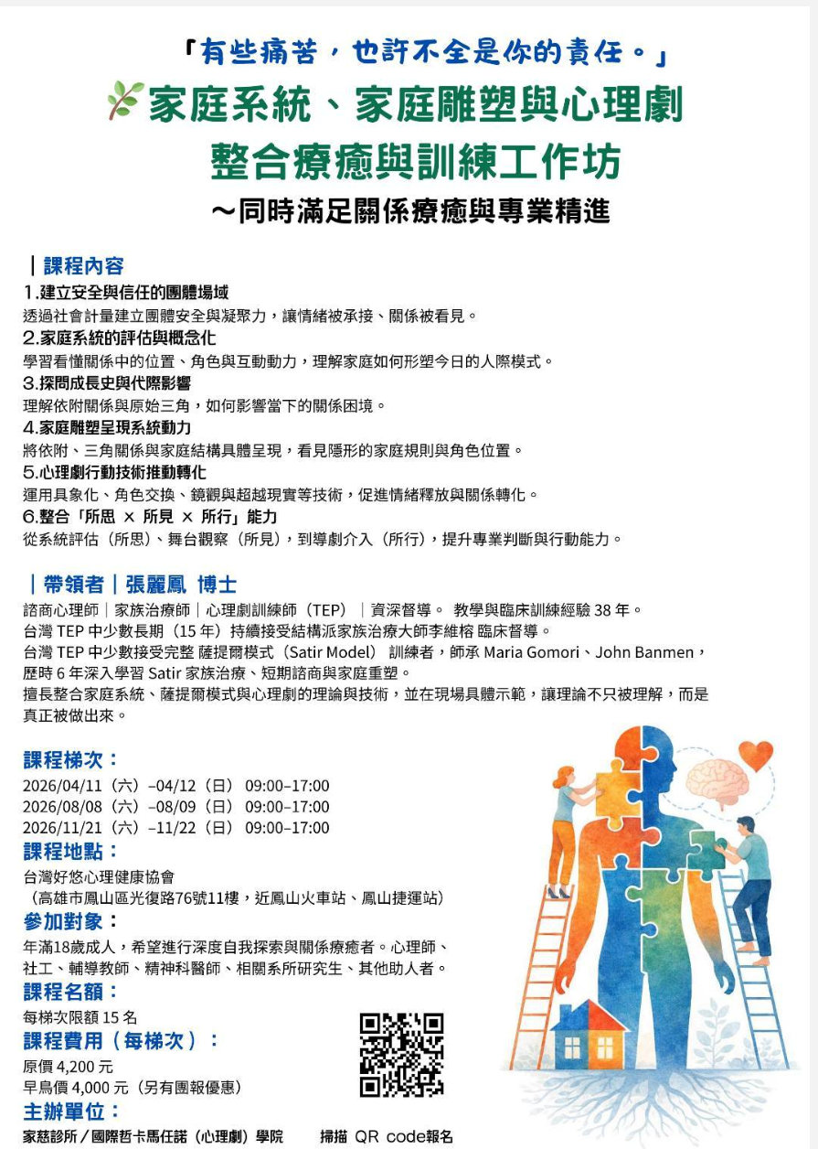 家庭系統 × 家庭雕塑 × 心理劇整合 療癒與專業訓練工作坊