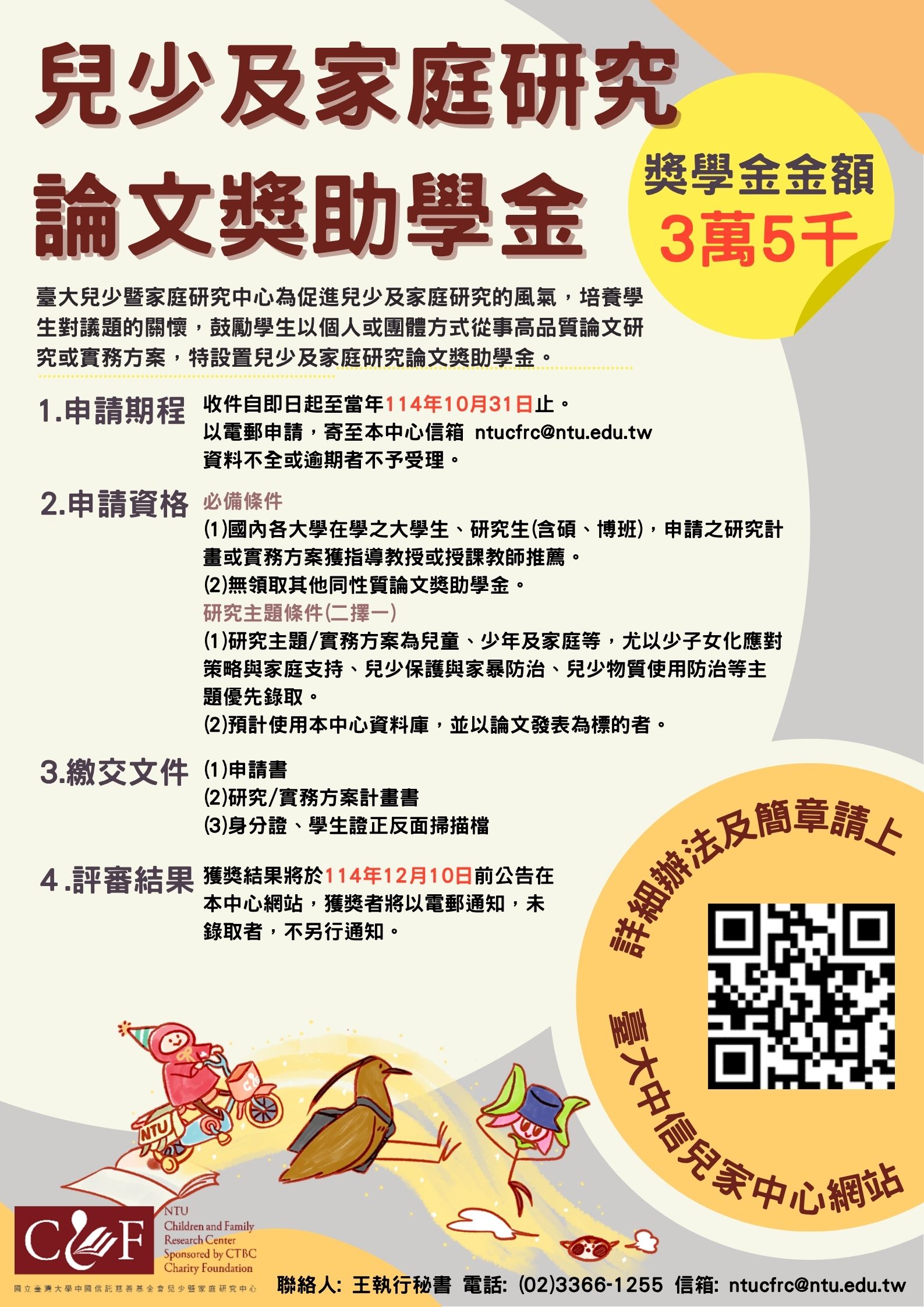 【臺大兒家中心】兒少及家庭研究「研究論文獎助學金」資訊