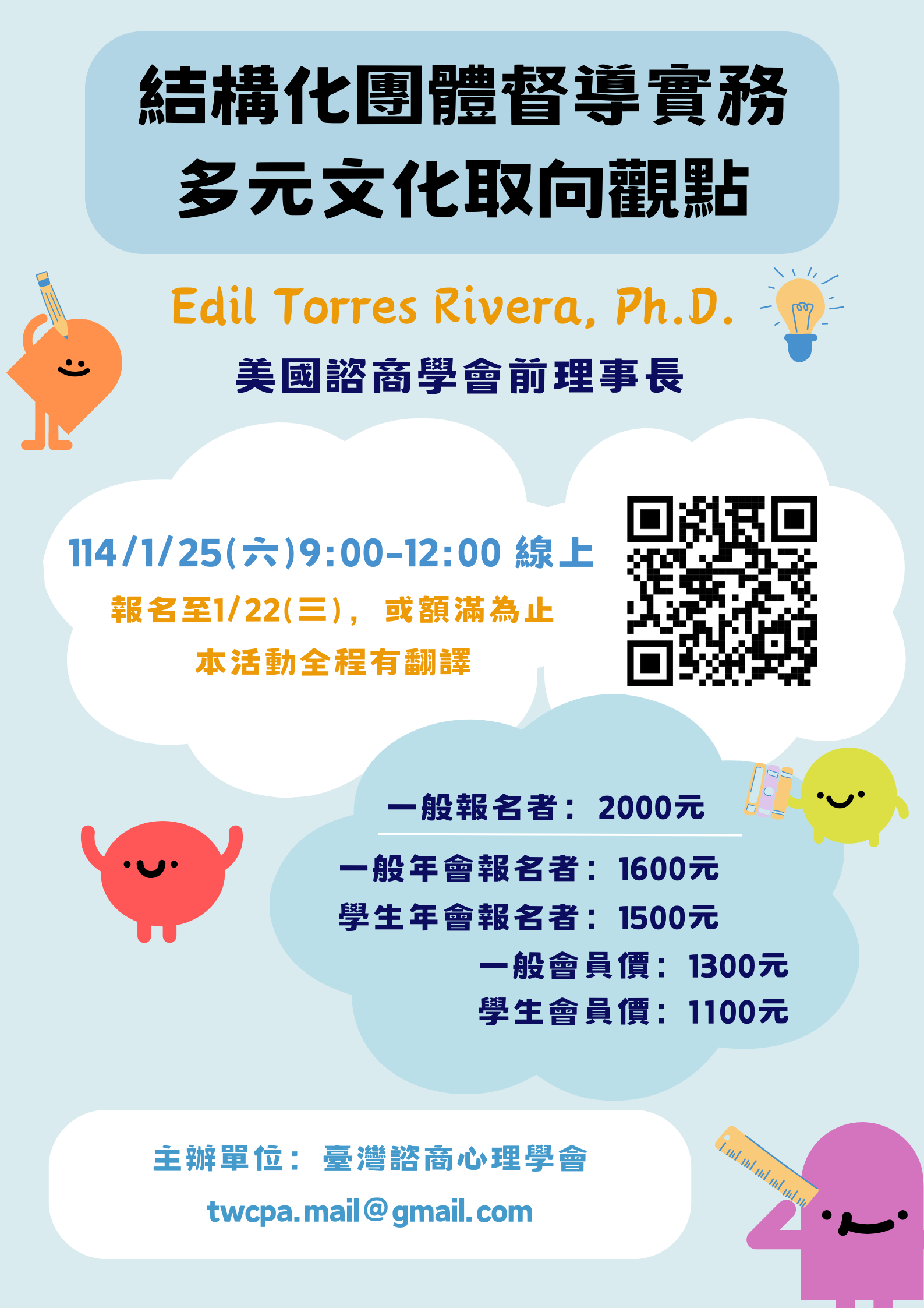 【課程內容】工作坊由國際知名的多元文化諮商專家Dr. Edil Torres Rivera教授主講,他有超過25年諮商經驗,並曾在美國陸軍 服役12年,致力於美國多元族群的服務,也是美國諮商學會Ame rican Counseling Association的前任主席。Dr. Rivera的研究涵蓋混沌理論、原住民治療技術及社會不公對少 數族裔的影響,本次三小時工作坊將結合其豐富經驗,深入探討如何 在多元文化脈絡中有效運用結構化督導及多元文化督導之工具, 幫助督導及受督者提升敏感度、增益效能、減少壓迫與內癮信念造成 的困局。