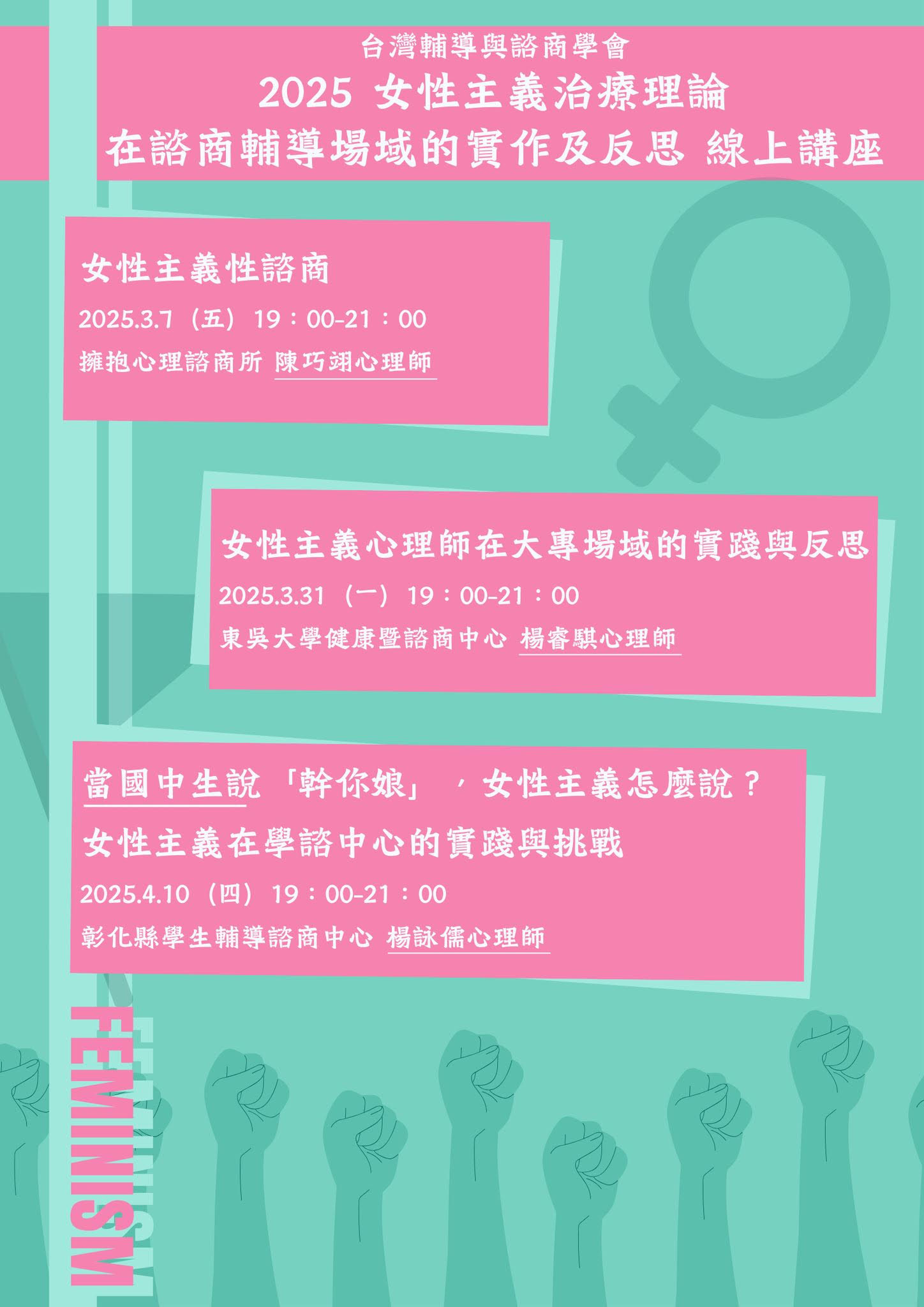 邀請你一同參與女性主義治療理論在諮商輔導場域的實作及反思。