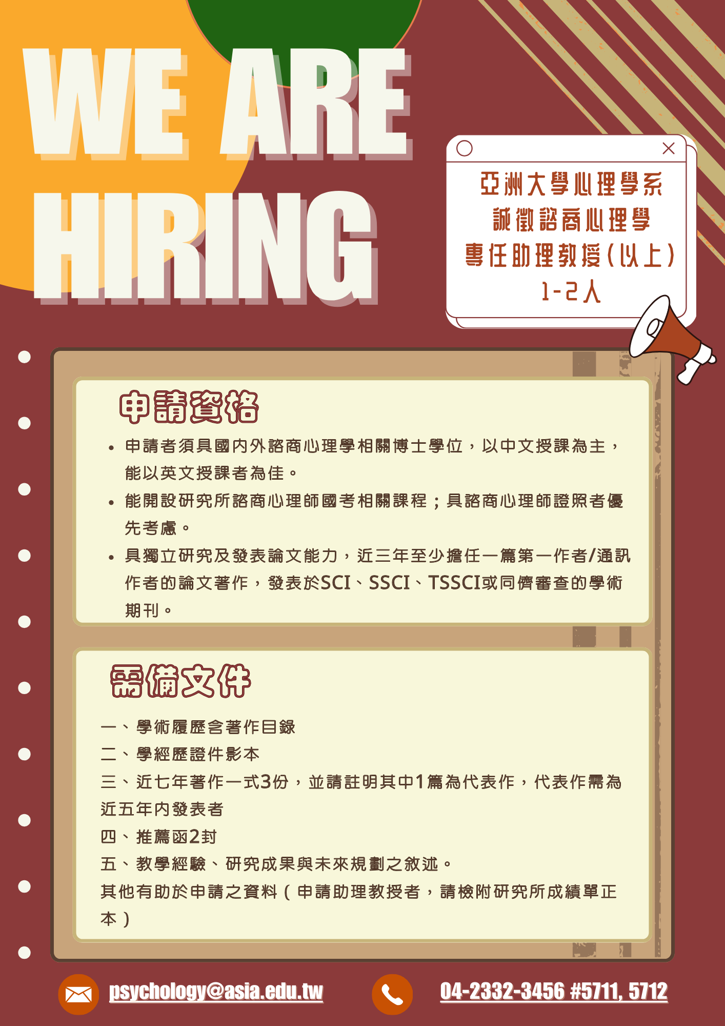 亞洲大學心理學系誠徵諮商心理學教師訊息,